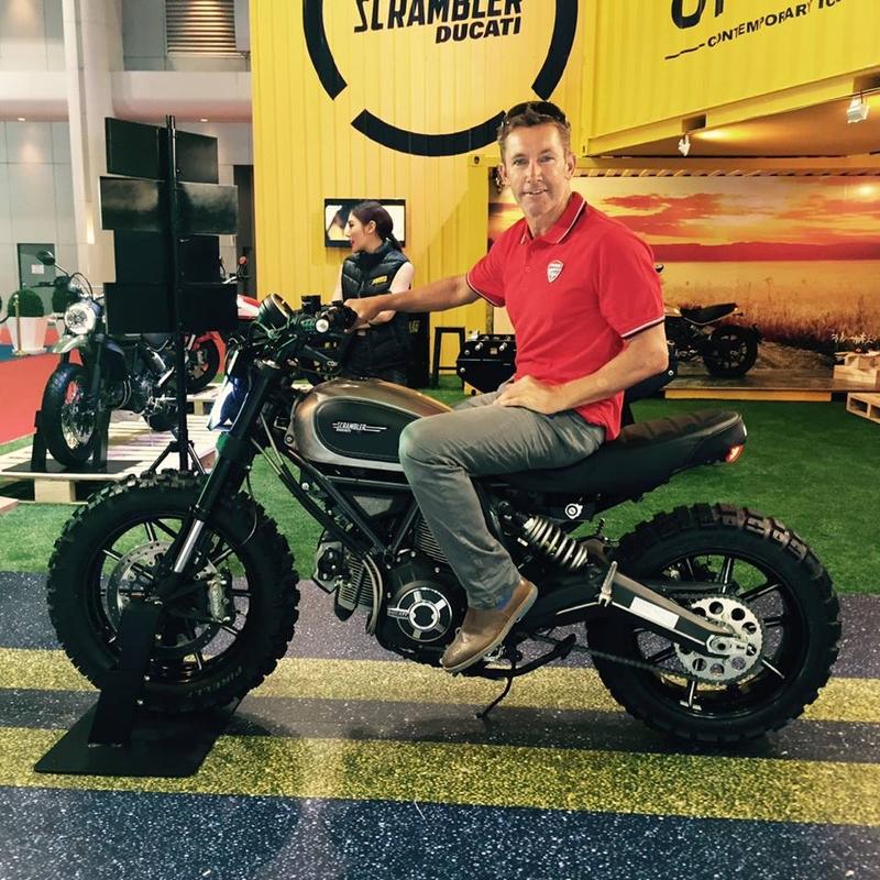 Photo of Troy Baybliss sitting on a customised Scrambler at the Bangkok International Motor Show 2015.