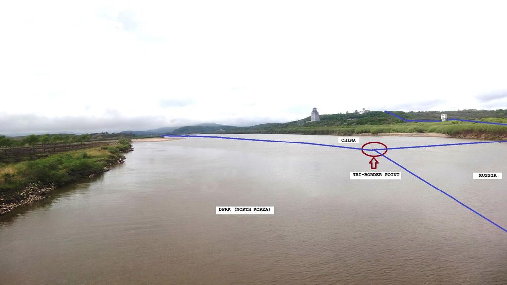 Below is a photo looking north from North Korea. You can see the international border crossing train bridge across the Tumen River from North Korea, north into Russia and the "spit" of china coming down from the NW with its look-out tower looking over North Korea & Russia