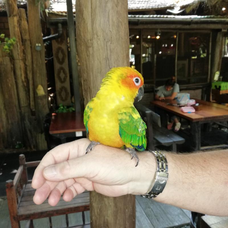 The owner, Khun Pichean, arrived with his adored pair of parakeets (South American Sun Canure).
