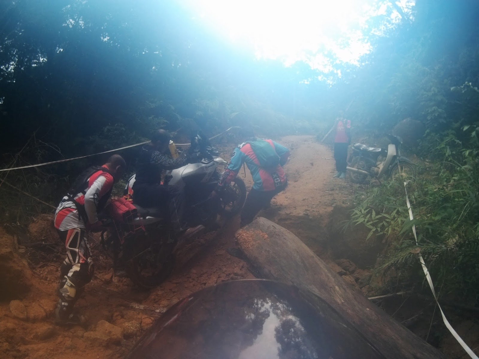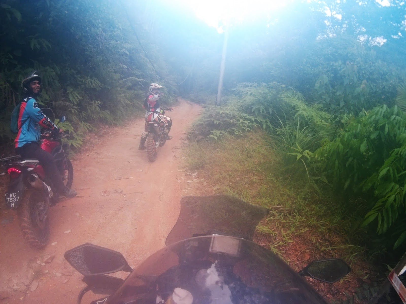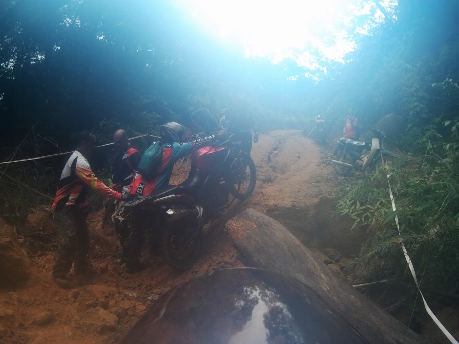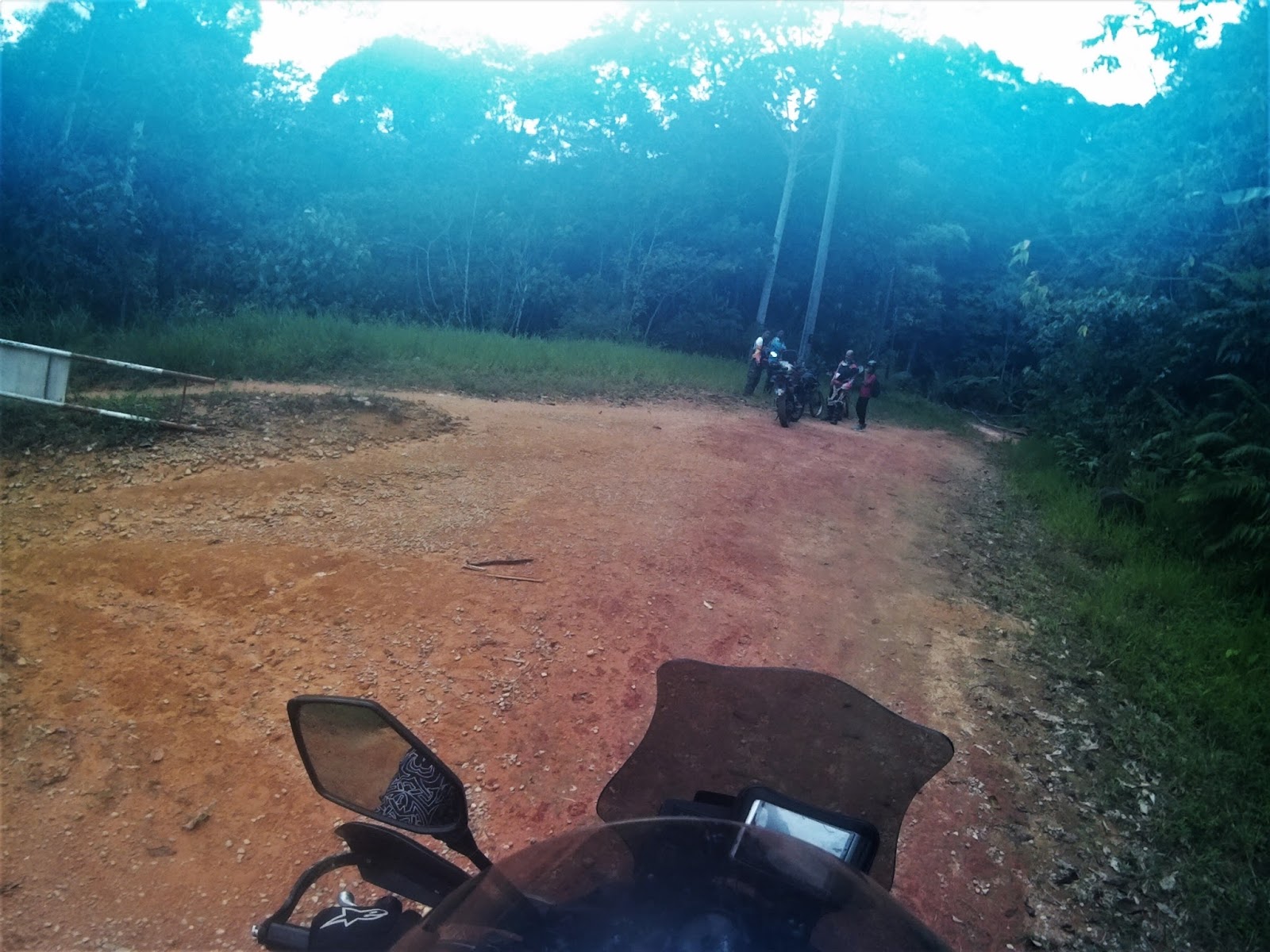 I was descending cautiously and slow as my rear tyres slipped sideways 80% of the way throughout the track. We regrouped at the water intake gate waiting for Kamalul and Apik.
