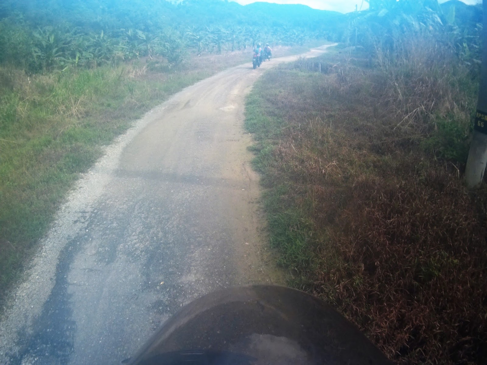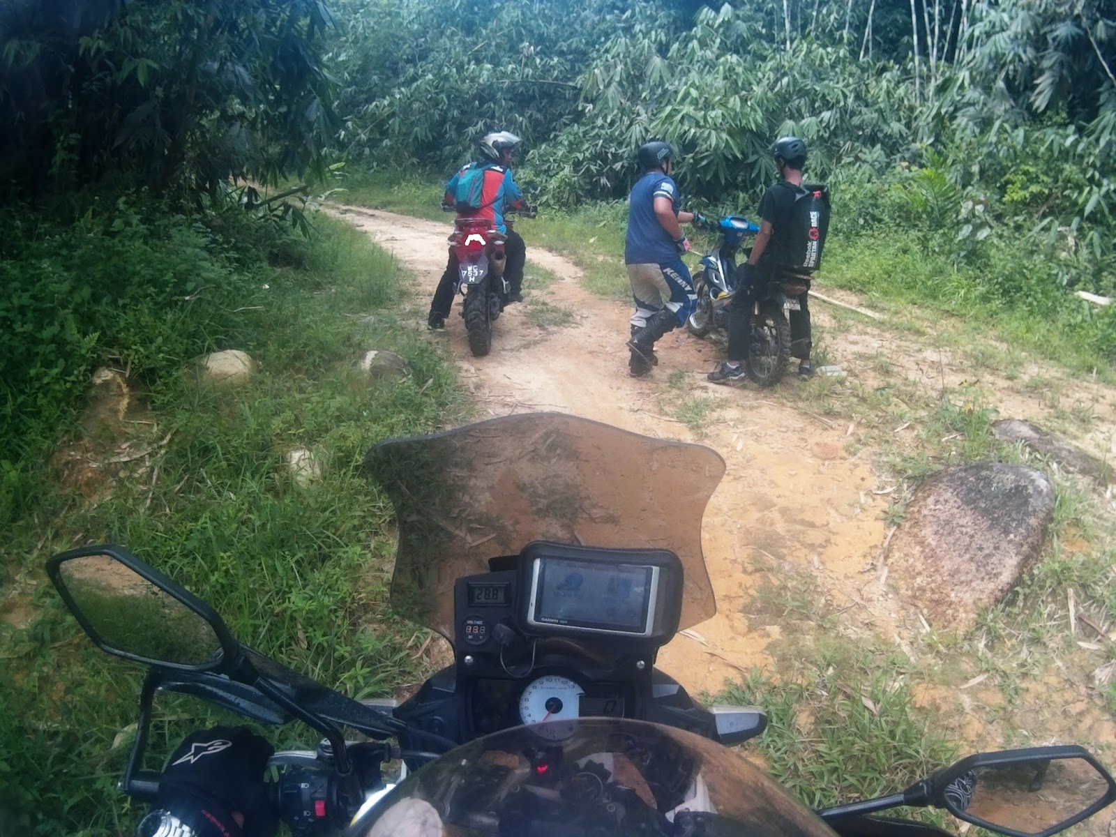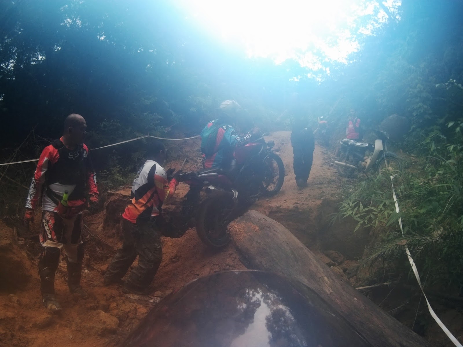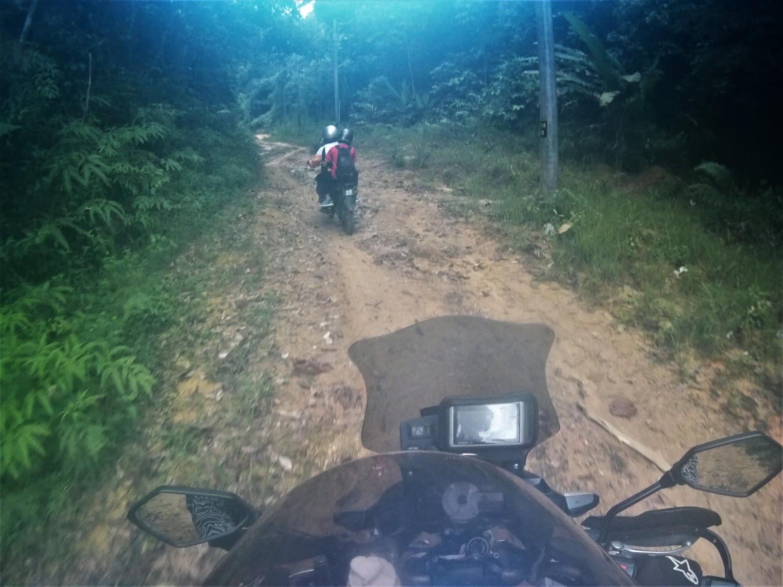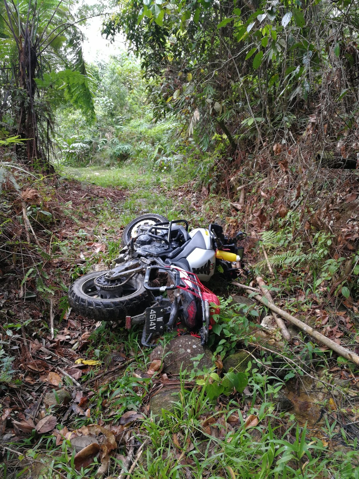 I was descending cautiously and slow as my rear tyres slipped sideways 80% of the way throughout the track. We regrouped at the water intake gate waiting for Kamalul and Apik.
