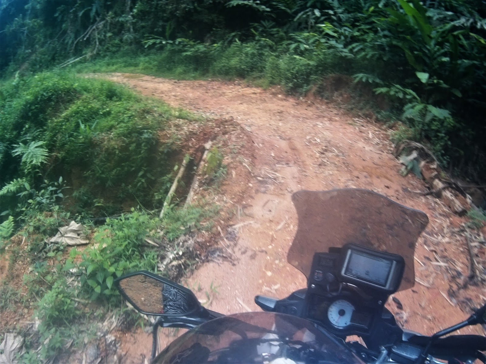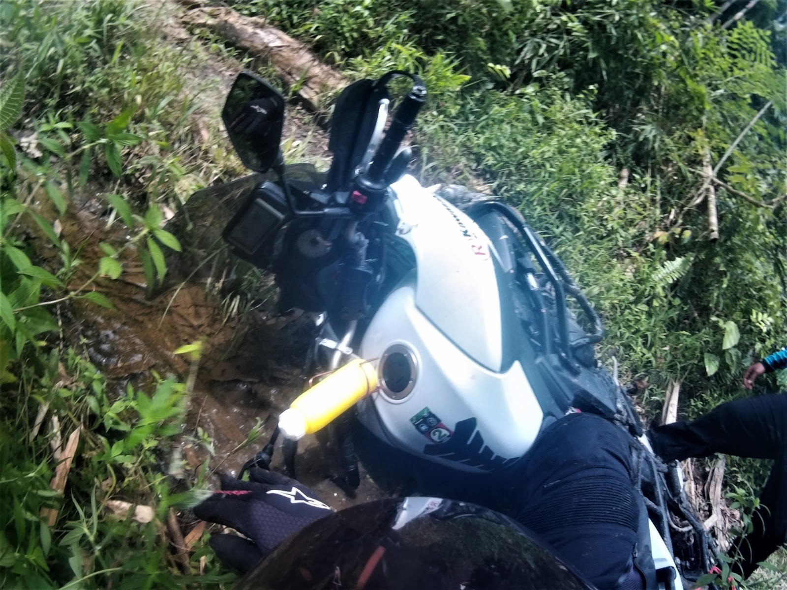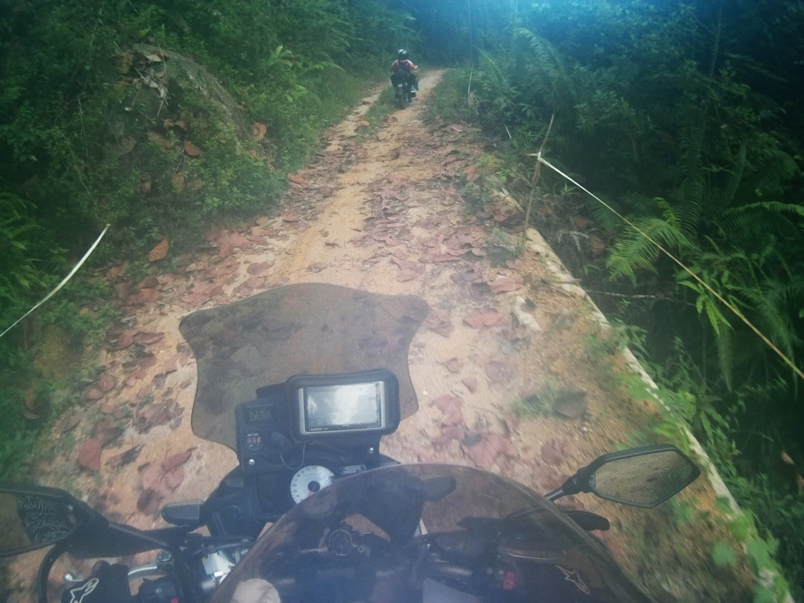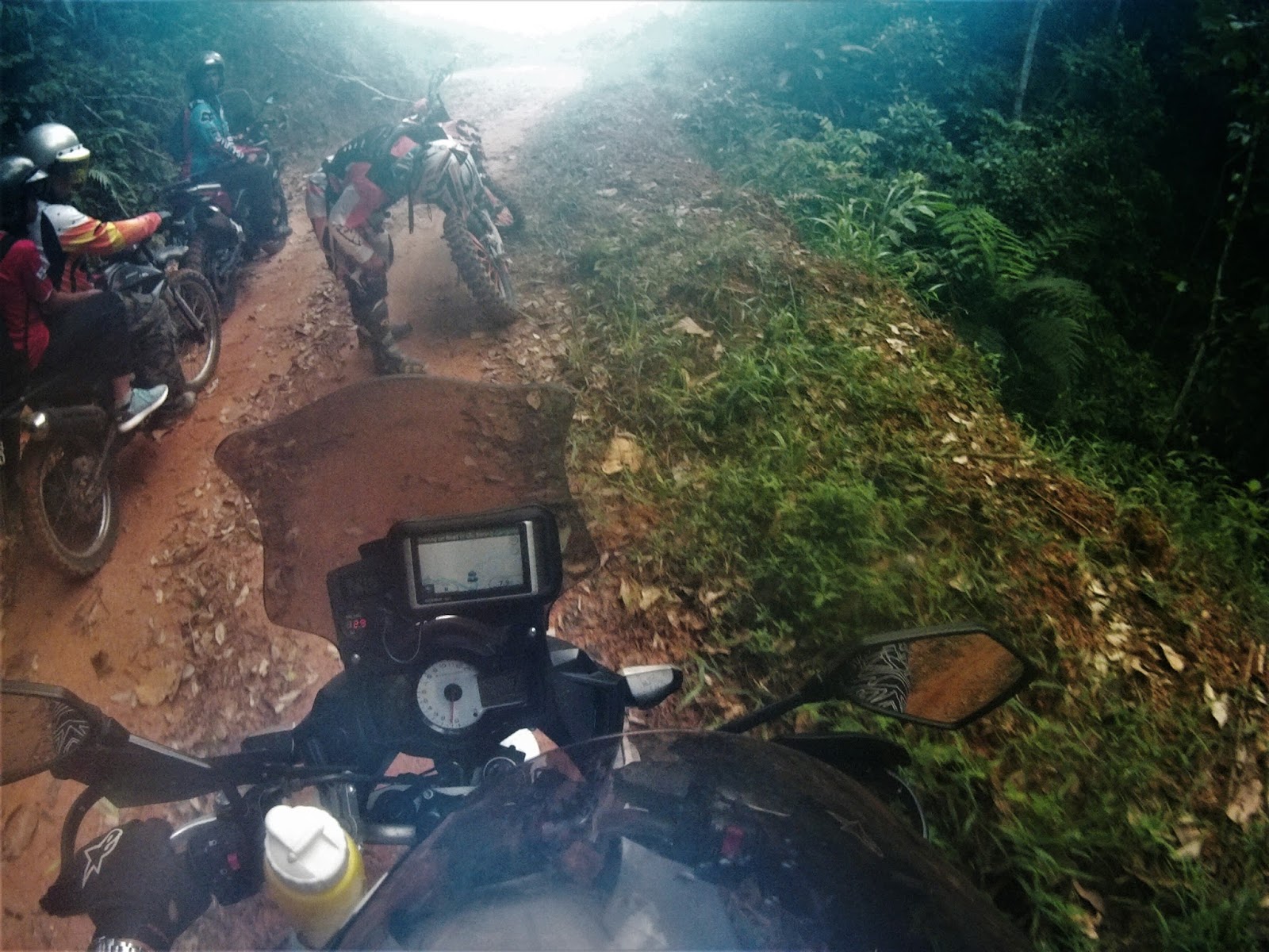 I was descending cautiously and slow as my rear tyres slipped sideways 80% of the way throughout the track. We regrouped at the water intake gate waiting for Kamalul and Apik.