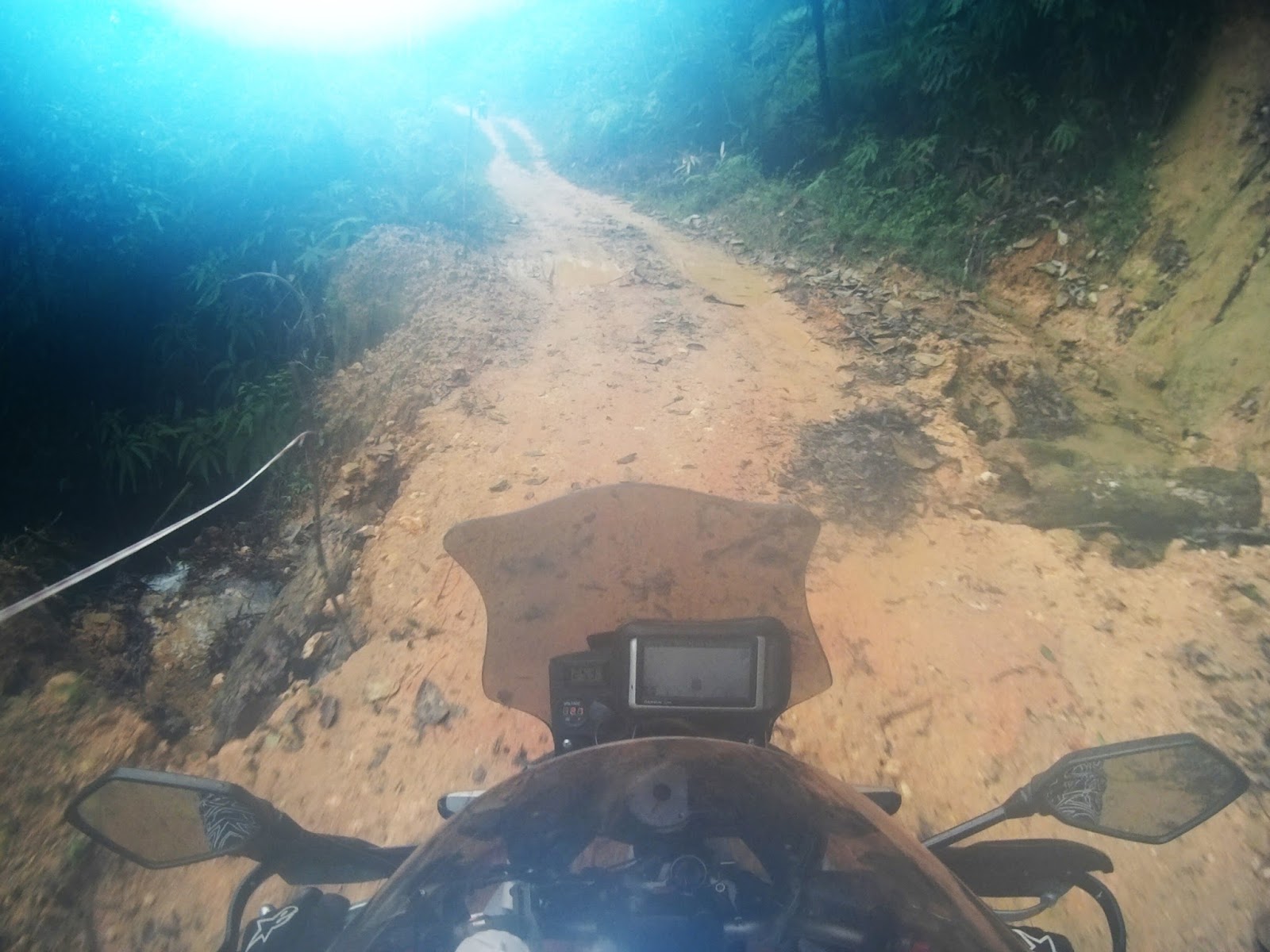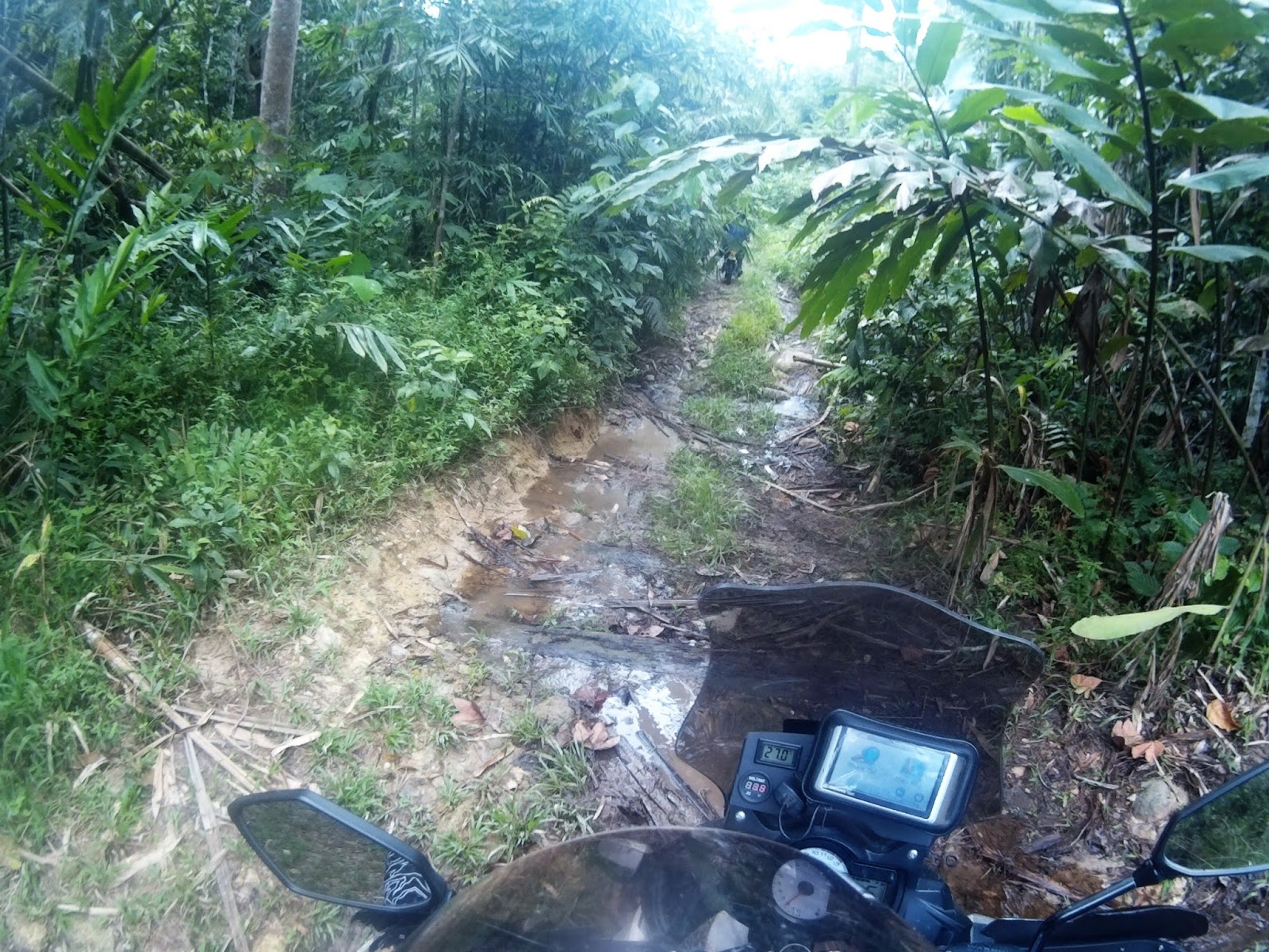 Heavy dual-purpose bikes like mine, will require a proper set of wheels to make the climb successful but on smaller and torquey enduro bikes, it should be a walk in a park, even during a rainy season. Another obstacle is a gate to prevent jungle poachers from entering this forest reserve, where we need to go around it through a small track in between the metal barrier and a ditch, pretty dangerous during wet condition.