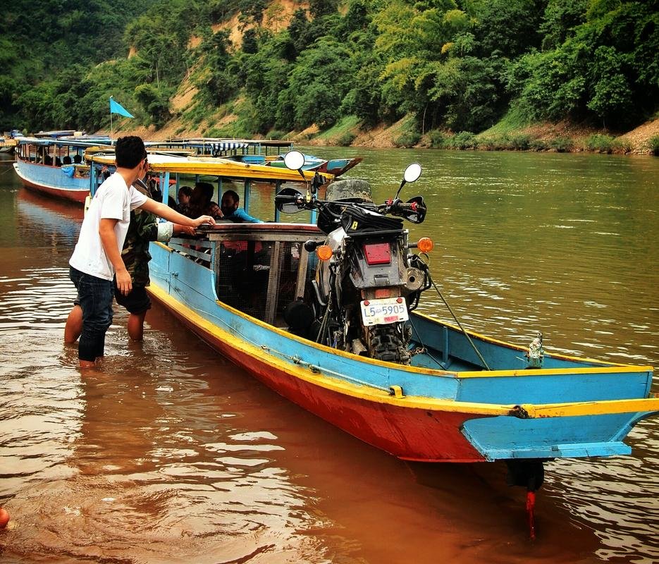 The next morning, I was hoping to get to float down the Nam Ou back to Nong Khiaw on a boat, although in my discussions with another motorbiker working for the German government, he figured that I would have to rent my own boat and it would cost between 1,300,000-1,500,000 kip, something way over my budget. I went down to the ticket office in the morning, as I heard there was a regular 9:30am 'tourist boat', and to my surprise I was quoted 300,000 kip for myself and the motorbike. I think they may have second-guessed that quote when I arrived with my 400lb KLR instead of a Honda Wave, but the ticket had already been bought. A group of about 8 friendly locals and tourists had to be organized to heave the bike onto the boat and 'secure' it down with a few pieces of rope. If you are concerned about your bike, I suggest you bring some of your own tie-downs, and make sure they place the motorbike at the bottom of the boat, not on the wooden slats. Most of the other tourists were quite amused at the display of human creativity and will in lieu of heavy machinery, and a 20,000 kip 'beer tip' seemed to satisfy my local helpers.