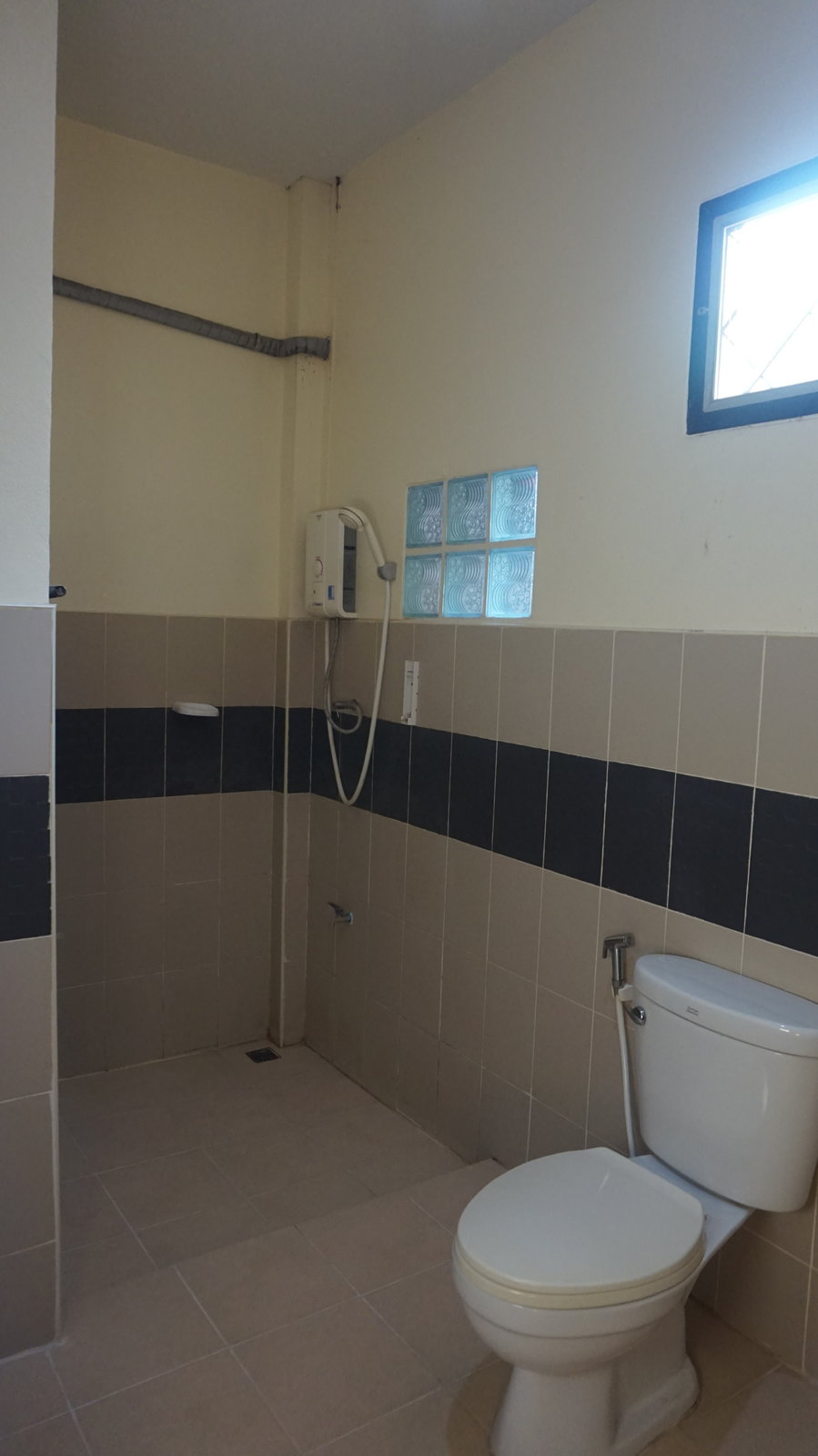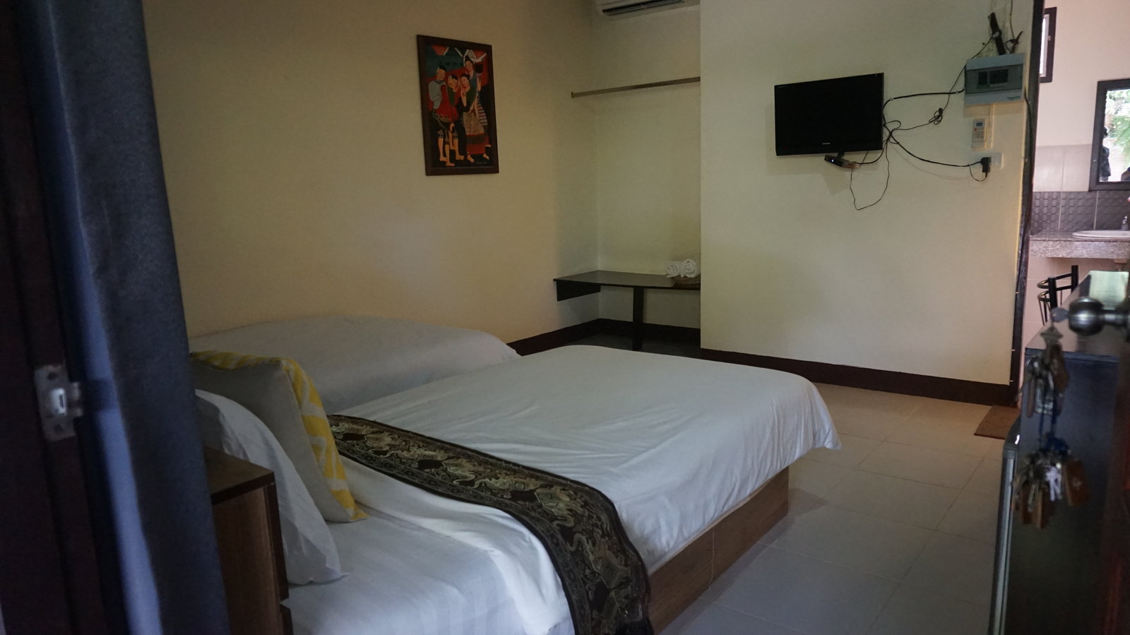 This fan bungalow with en suite shower/ bathroom and TV is 250 Baht a night, there is also AC bungalows at 350 Baht a night