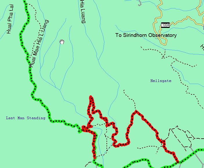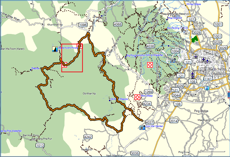 Could do something like this, but that section in the red rectangle says "not for rainy season", I've no idea what this bit of trail is. Will ask Alex if he knows, he's the master of Ob Khan...
