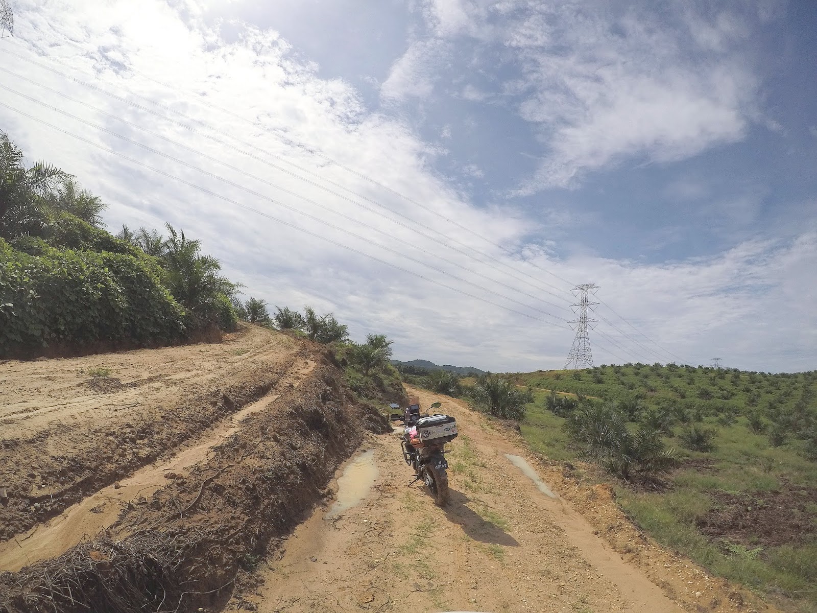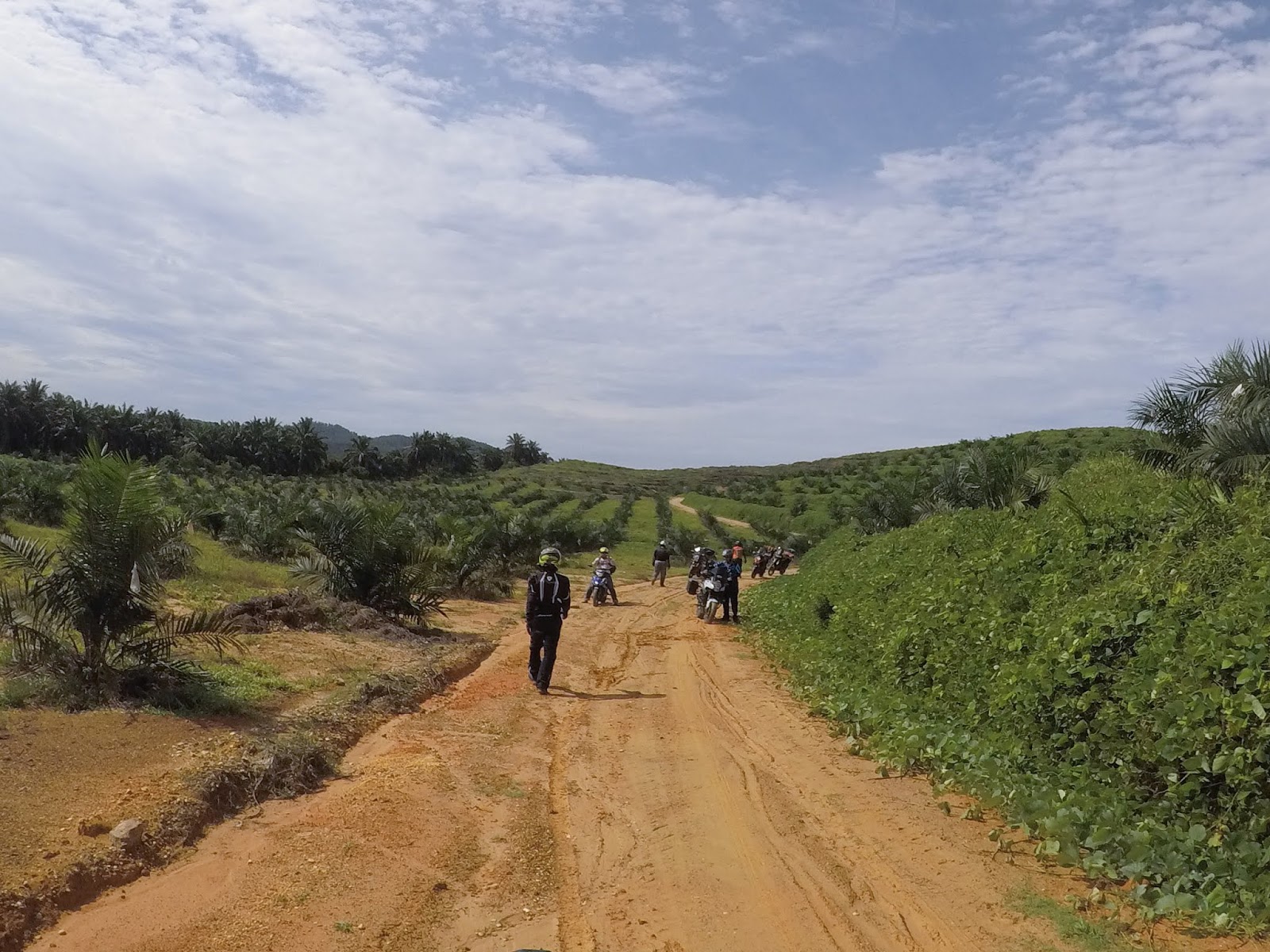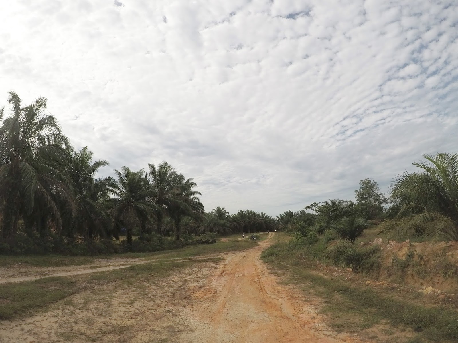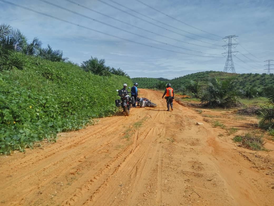 We continued through palm oil plantation trail until we reached an opening. In this newly replanted area, the palm trees are still short and the trail surface changed from sand to soft red mud. We’ve struggled to pass this area as our tyres had very little traction and we took almost an hour to travel just 2km towards a gate that leads to a cattle farming area.