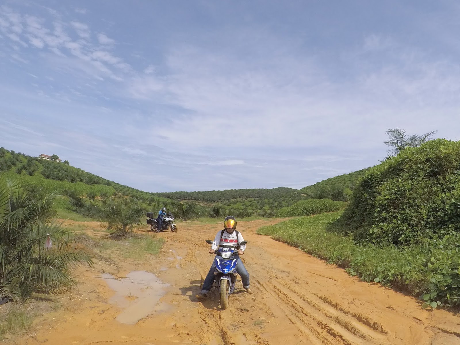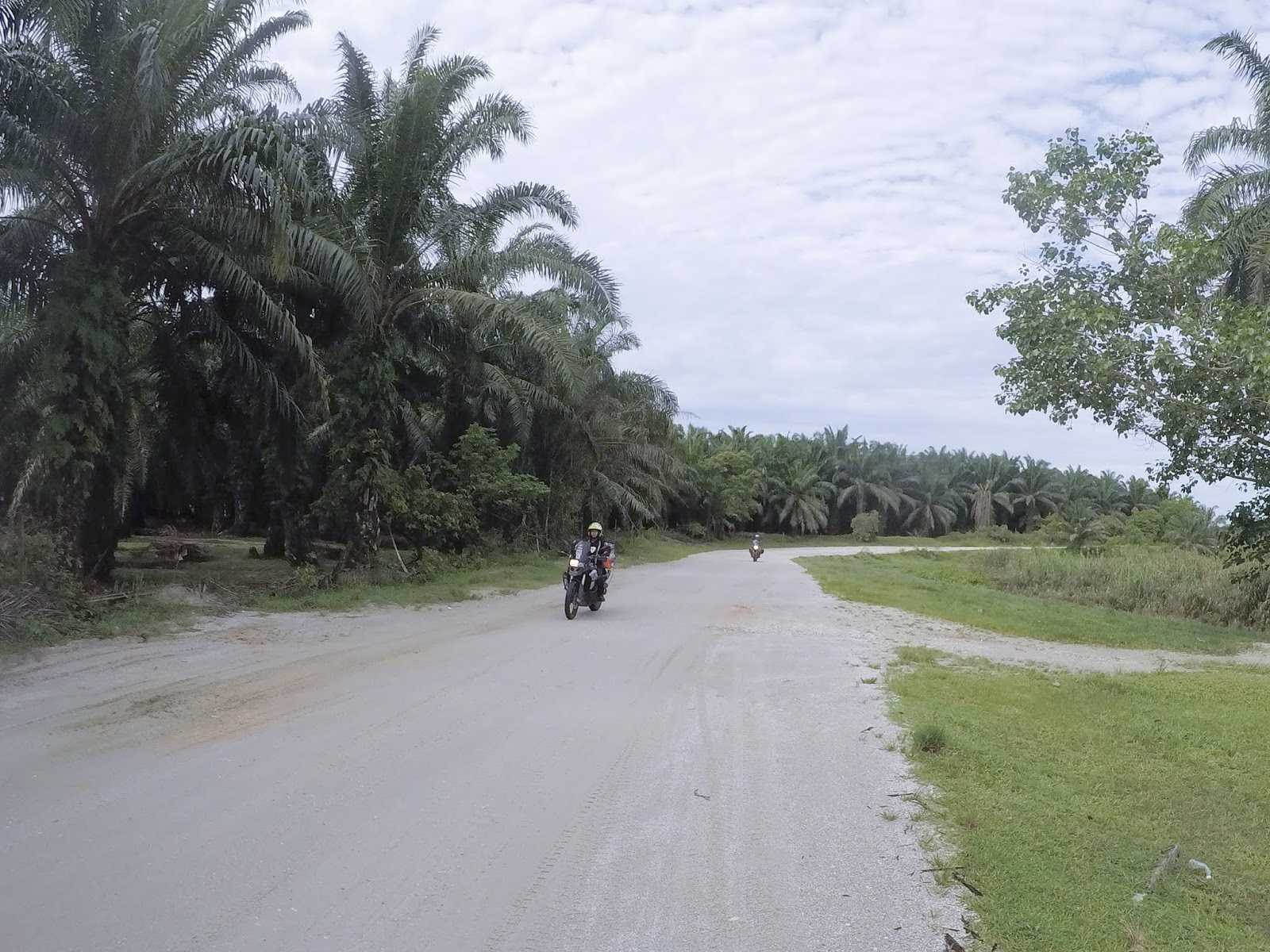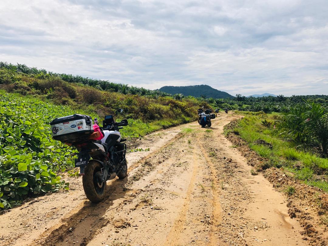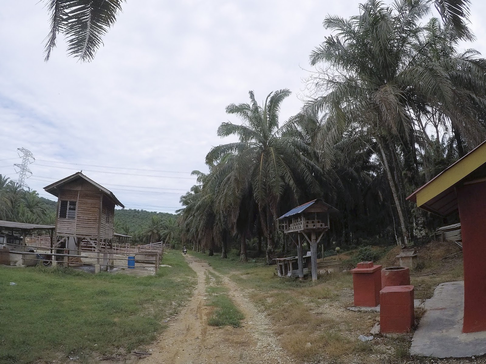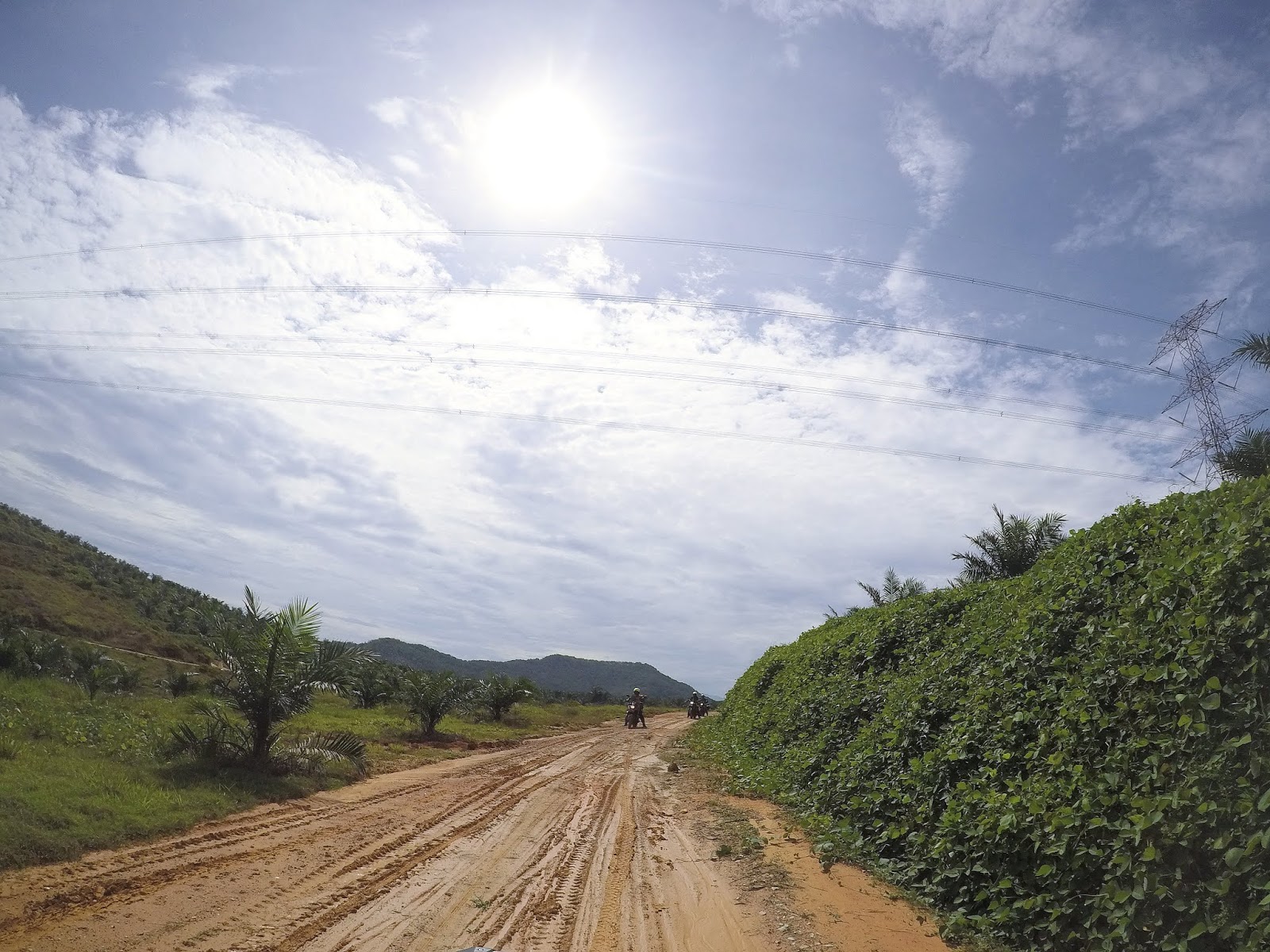 We continued through palm oil plantation trail until we reached an opening. In this newly replanted area, the palm trees are still short and the trail surface changed from sand to soft red mud. We’ve struggled to pass this area as our tyres had very little traction and we took almost an hour to travel just 2km towards a gate that leads to a cattle farming area.
