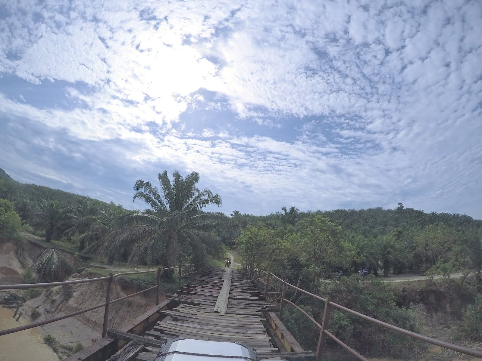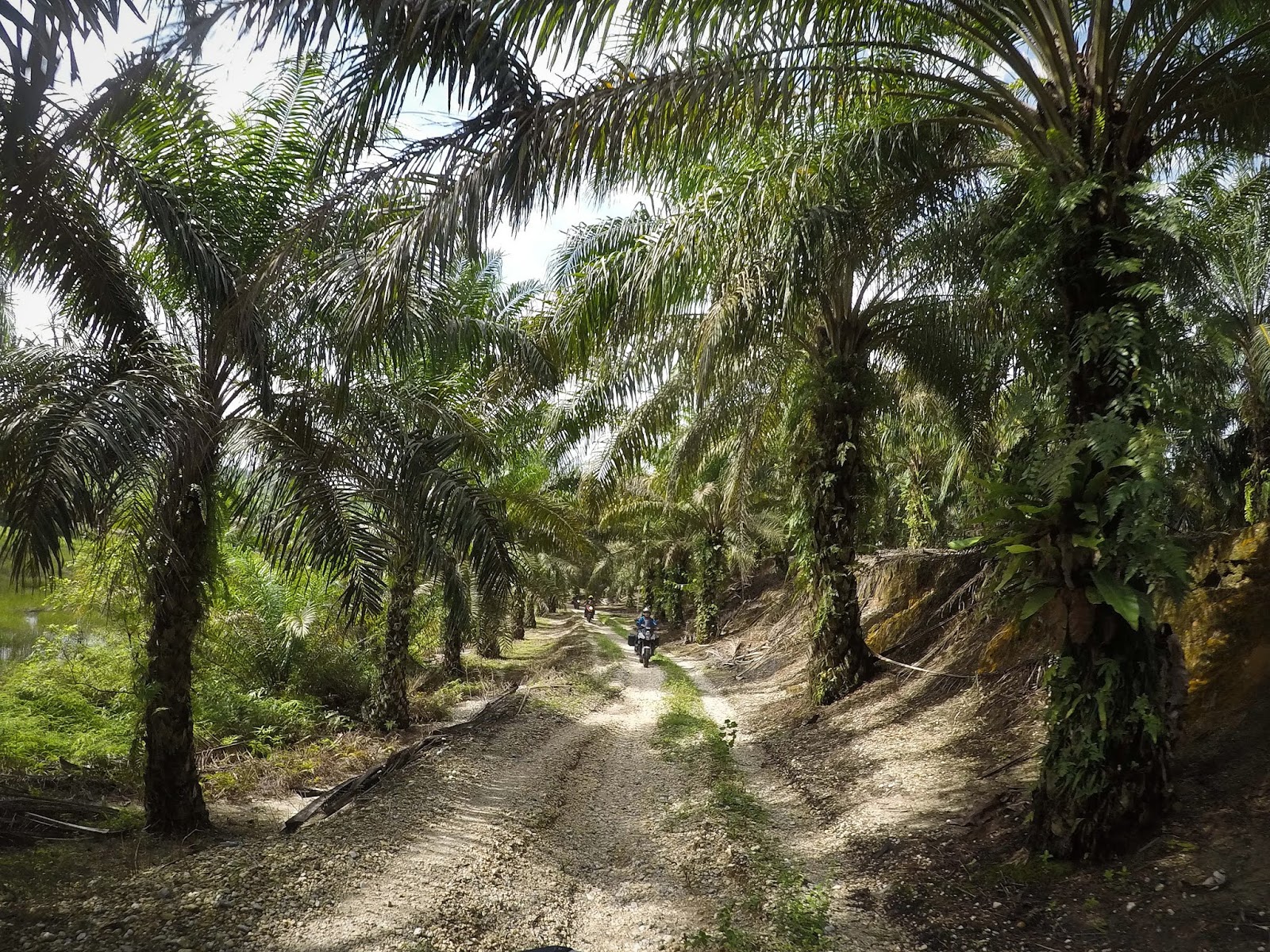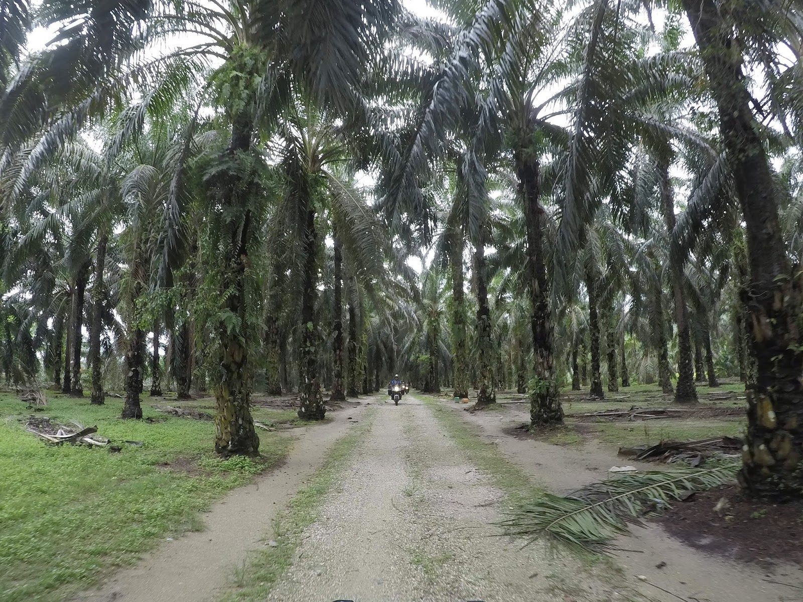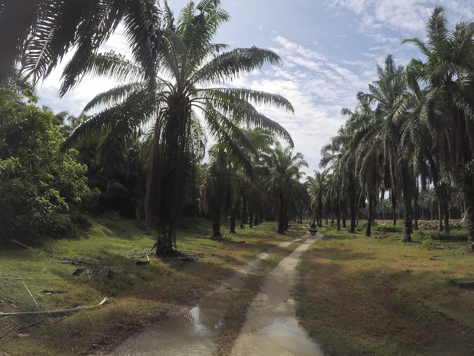 We continued through palm oil plantation trail until we reached an opening. In this newly replanted area, the palm trees are still short and the trail surface changed from sand to soft red mud. We’ve struggled to pass this area as our tyres had very little traction and we took almost an hour to travel just 2km towards a gate that leads to a cattle farming area.