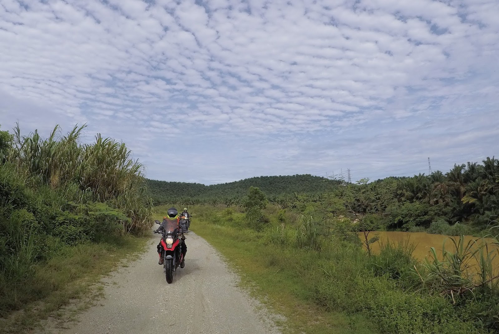 The trail started through a private road on tarmac and turned left into plantation road with sandy surface. The whole day rain yesterday has made the sand more compact and fun to ride and all of us rode swiftly towards a steel bridge.