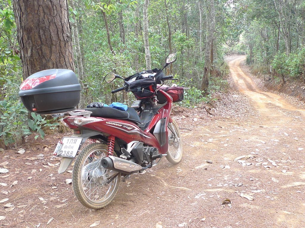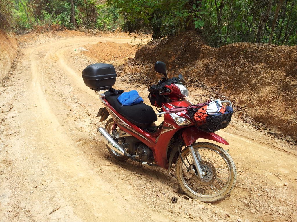 Made it to Wat Chan and the skies were threatening so refuelled and kept going. The Elephant Trail is just a double trail over the mountains with big drop-offs into dense escarpments. And very little traffic. The Wave is the choice of locals but the first steep incline proved that the trail needs to be ridden, now wish I had given attention to tyres before leaving. I stopped halfway up as I didn’t approach it hard enough and slid backwards under brakes until finding rest in the gutter between vehicle tracks. My tyres are worn down street so let the pressure down to get some grip. From then on it was full blast up the hills all the way.